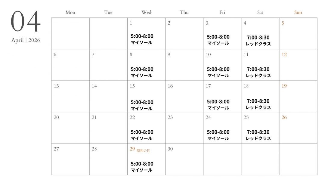 1ヵ月以内にある全てのクラスを受けることができます。(マイソールクラス、レッドクラス共に)開催数に限らず、毎月同じ金額になりますので、クラス数が多い月は非常にお得なプランになります。もちろん、日程の変更についても自由です。